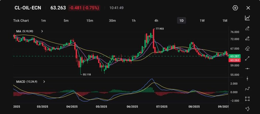 Picture: CL-OIL-ECN trades at 63.263, down 0.75% from its recent level as shown on the VT Markets app.