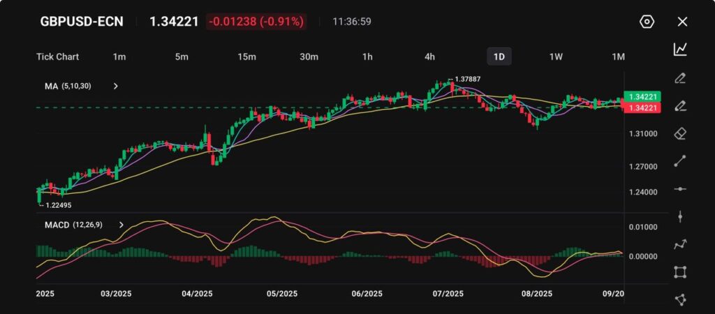 Picture: GBPUSD-ECN trades at 1.34221, down 0.91% from its recent high as it shown on the VT Markets app.