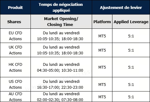 1. Toutes les spécifications des CFD sur actions restent les mêmes, à l’exception de l’effet de levier pendant la période mentionnée.